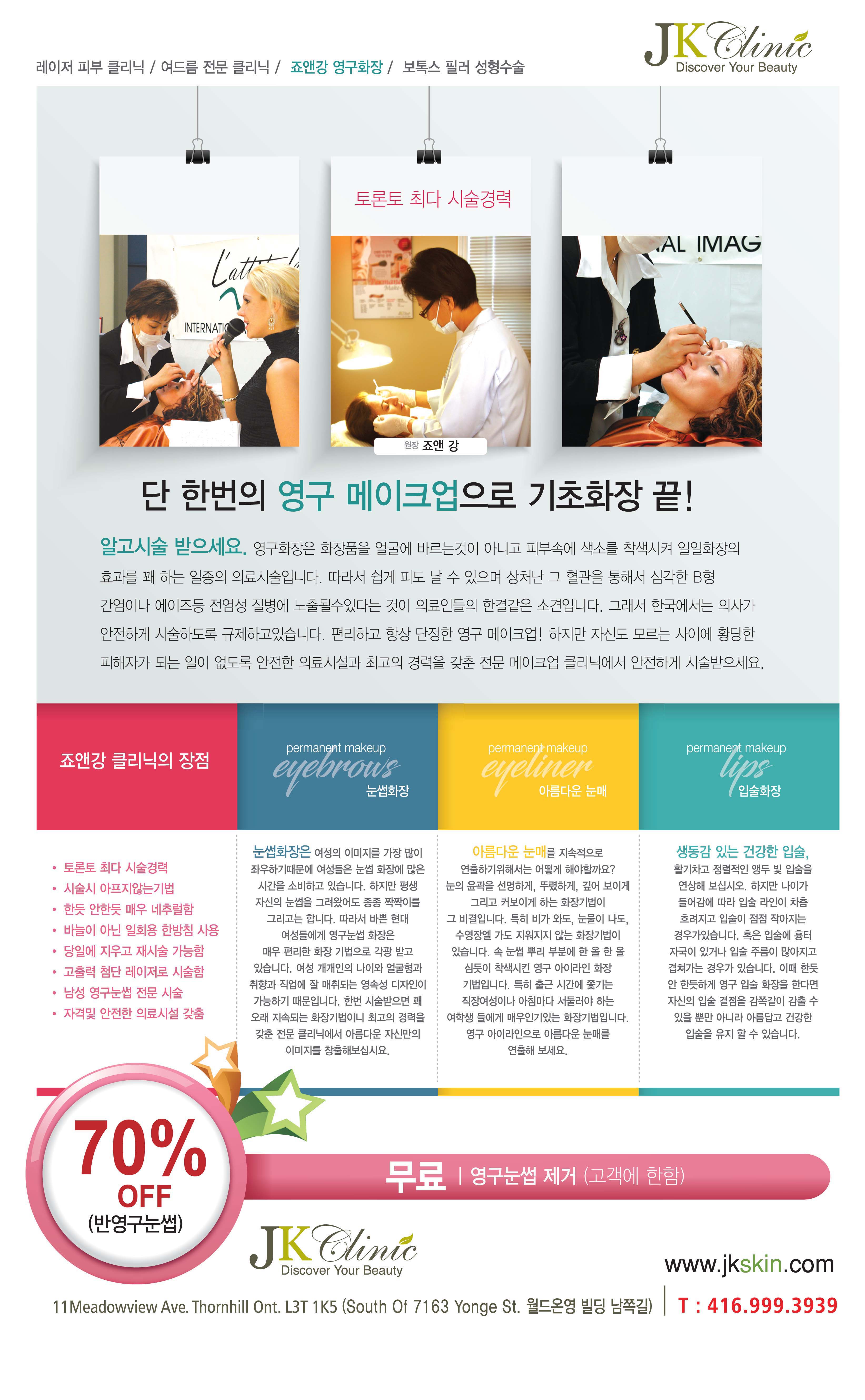 토론토에서 가장 많은 시술 경력을 쌓아왔고 안전하게 시술하는 JK Clinic 에서 시술받으세요.